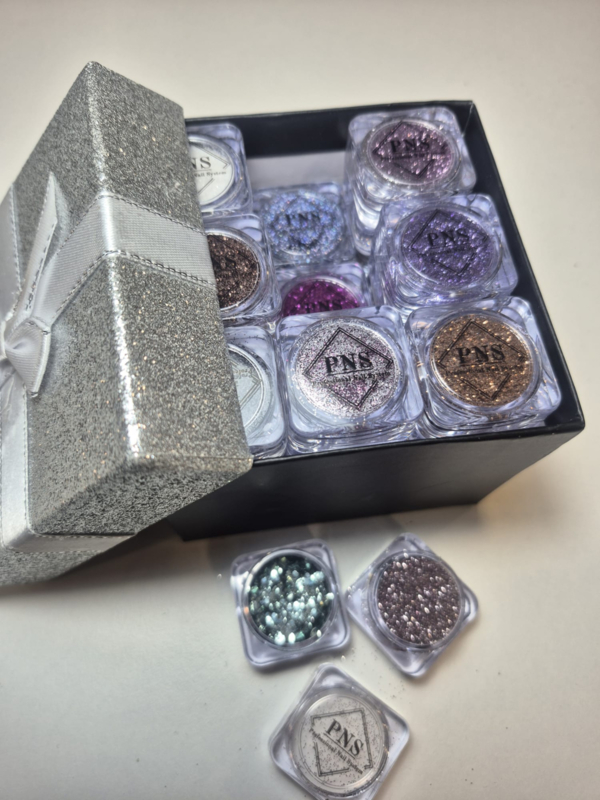Glitterbox gevuld met 12 kleuren glitter en inlay glitterCreëer Diepte en Glans met Onze Inlay Glitter Collectie